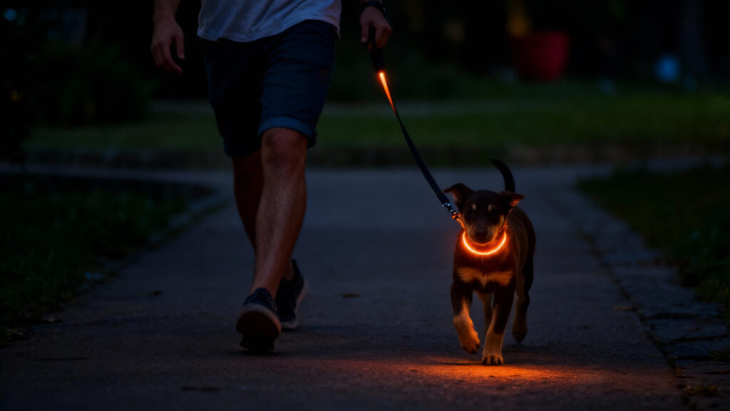 Why is it necessary to consider an LED light-emitting leash when walking dogs at night in winter?
